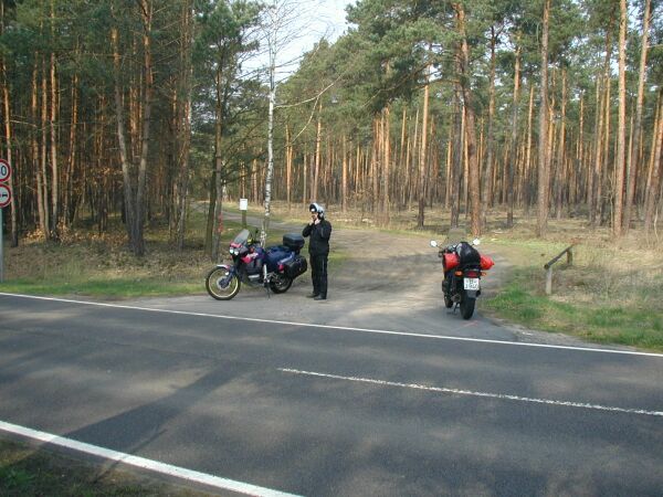 Zunächst führte uns unser Weg über die AVUS raus aus Berlin und über den südlichen Berliner Ring bis zur B101. Von hier fuhren wir über Trebbin Richtung Luckenwalde. Kurz vor Beginn der neuen Umgehungsstraße von Luckenwalde machten wir die erste kurze Pause. Wenig später kamen wir an unserem ersten Unfall an diesem Tag vobei: Von einem "Klaufix" war wegen der offensichtlich viel zu schweren Holzbeladung bei einem Bremsmanöver die Deichsel gebrochen. Keine Stunde später standen wir erneut in einem Mini-Stau: Ein Pkw hatte sich kopfüber in den Graben gelegt. Unsere Fahrt fing also schon mal recht "interessant" an.
