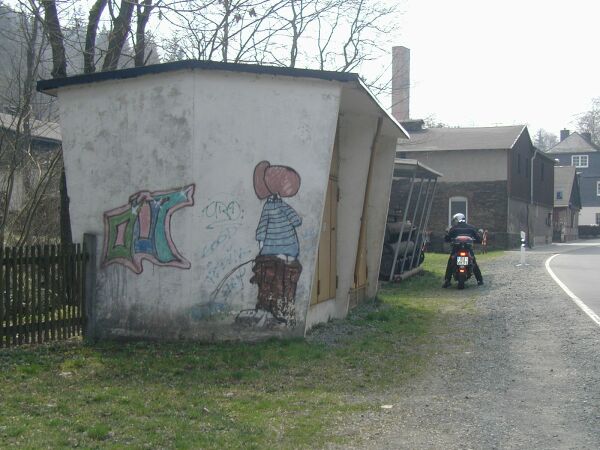 Kurz bevor wird den schönen Frankenwald für dieses Jahr endgültig verließen, verabschiedeten wir uns noch in Schwarzenbach und fuhren anschließend gen Berlin. Für kurze Zeit verlief die Fahrt auch ohne "Komplikationen", doch schon in Blankenstein nahm das Verwirrspiel um die Umleitungen seinen Lauf. Eigentlich sollte es ja von Blankenstein über Harra nach Lobenstein gehen, doch wegen einer Straßensperrung mußten wir über Kissling und Lichtenbrunn fahren. Aber dies war nicht das letzte mal an diesem Tag und in dieser Gegend, daß ich den Weg anders fahren mußte als es ursprünglich angedacht war. Außerdem waren die Straßen zwischen Lobenstein und Possneck teilweise in einem erbärmliche Zustand, so daß ich jeden Moment damit rechnete, daß etwas von meiner K abfallen würde. Besonders die Gegend um Ziegenruck ist mir in sehr schlechter Erinnerung geblieben. Aber wir wußten nun auch, warum die wenigen anderen Motorradfahrer, die wir hier gesehen hatten, fast ausnahmslos "GS" fuhren. Was mir hier noch auffiel, war diese Menschenleere auf den Straßen. Nicht nur einmal hatte ich das Gefühl durch Geisterorte zu fahren.