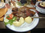 Zu Mittag gegessen haben wir in einem kleinen einfachen Gasthof unweit von Seehausen. Es gab lecker Ganz mit Apfelrotkohl. Auf der anschließenden Weiterfahrt nach Hankensbüttel sahen wir schon von weitem eine riesige Regenwand, die sich träge von Norden nach Süden vor uns vorbeischob. Mit ziemlich viel Glück und ungewolltem aber sehr präziesem Timing fuhren wir westwärts immer genau dort entlang, wo die Regenfront noch vor kurzem ihre Wassermassen hatte niedergehen lassen.