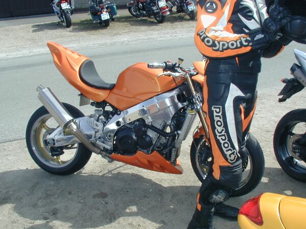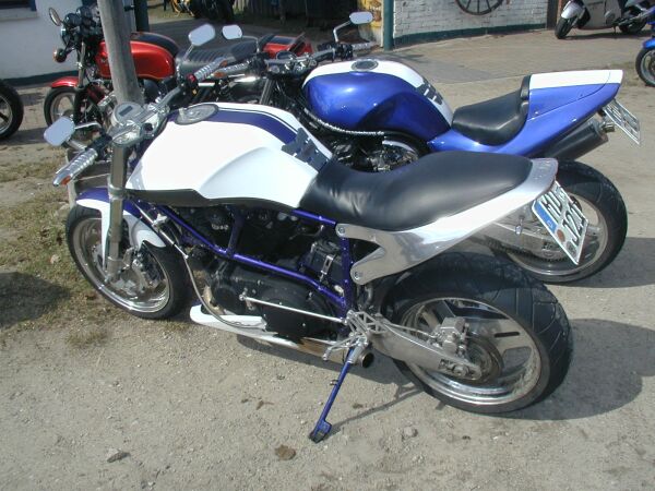 Kurz hinter Brandenburg machten wir dann schließlich an der B1 noch einmal kurz Pause. Während dieser Zeit versuchte ich Bernd´s Moto Guzzi V11 auf den "Hilfs-"Hauptständer zu wuchten - was ich aber nach einem unschönen Plastik-Knirsch-Geräusch dann sofort wieder sein ließ. Eine anschließende Kontrolle ergab (zum Glück) keinen negativen Befund. Nix schien nachhaltig in Mitleidenschaft gezogen worden zu sein. Es blieb für mich der Eindruck zurück, daß man/frau schon sehr genau wissen sollte, wie und wo man/frau solch eine "italienische Lady" anpackt...