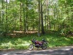Hier im Wald war es nun ziemlich dunkel und einsam und ich war mir immer noch nicht sicher, ob ich hier doch nicht falsch war. Es folgte Kilometer um Kilometer über diese kaum fahrbare Piste. Mehr als 30 km/h war einfach nicht drin. Einmal kam ich in tieferen Zuckersand und das Vorderrad ging nach rechts weg. Doch aus meiner Endurozeit kannte ich ja sowas - aber der Schreck war erst einmal da. Ich ließ es nun etwas vorsichtiger angehen. Nach ca. 6 Kilometern auf dieser immer noch ziemlich schlechten Strecke kam mir dann aber ein PKW entgegen. "Der Förster", dachte ich. Doch es war "nur" eine Familie beim Ausflug. Bei dem Gedanken, daß sie jetzt noch mit ihrem PKW die Strecke zurücklegen mußten, die ich schon mit dem Motorrad gekommen war, konnte ich mir ein Grinsen unter dem Helm nicht verkneifen.