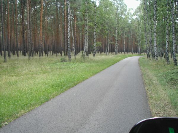 Kurz darauf erreichte ich eine kleine und bessere Asphaltstraße, die L43, die quer zu meiner Fahrtrichtung verlief. Ich erschrak regelrecht, als von links ein LKW recht zügig an mir vorbeirauschte. Der Blick auf die Karte verriet mir, daß ich noch einmal eine solche Entfernung vor mit hatte, bis ich aus dem Schlaubetal heraus war. Ich stellte mich also seelisch schon auf die nächsten "Spaßkilometer" ein. Doch ich wurde positiv überrascht: Nach einem nur kleinen holperigen Stück Flickenpiste wurde diese zu einer sehr schönen schmalen Asphaltstraße, die nun durch einen herrlichen Birkenhain verlief. Wenig später wurde die Straße noch einmal breiter. An der guten Qualität änderte sich nichts. Und wieder die Straße bei gleichbleibender Qualität ein Stückchen breiter. Schließlich war aus ihr bei Leeskow die schöne zweispurige Landstraße L452 geworden.