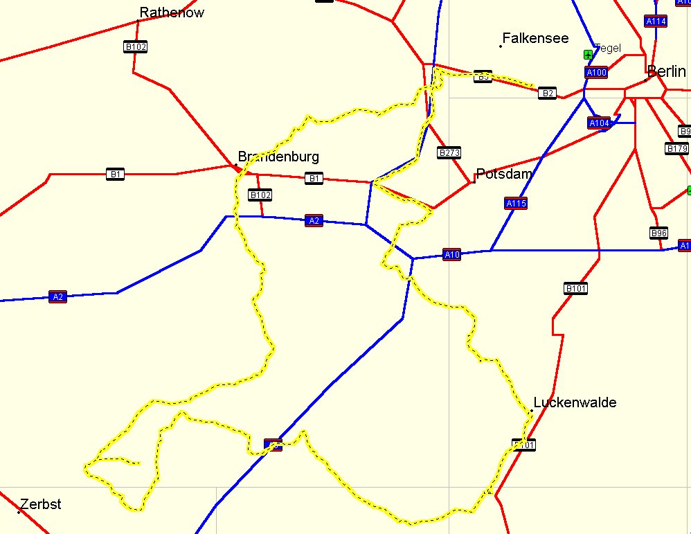 Treffpunkt "B5" - Priort - Buckow-Kapzow - Falkenrehde - Ketzin - Roskow - Weseram - Klein Kreutz - Brandenburg/Havel - Göttin - Reckahn - Krahne - Grüneiche - Golzow - Ragösen - Dippmannsdorf - Schwanebeck - Belzig - Klein Glien - Wiesenburg - Reetz - Reuden - Dobritz - Mühro - Polenzko - Bärenthoren - Krakau - Hundeluft - Stackelitz - Medewitzerhütten - Wiesenburg Bahnhof - Jeserig/Fläming - Grubo - Rabenstein/Fläming - Rädigke - Neuendorf - Niemengk - Hohenwerbig - Zeugen - Marzahna - Schönefeld - Kurzlipsdorf - Seehausen - Dennewitz - Rohrbeck - Jüterbog - Kloster Zinna - Luckenwalde - Berkenbrück - Hennickendorf - Dobbrikow - Rieben - Zauchwitz - Beelitz - Beelitz-Heilstätten - Fichtenwalde - Klaistow - Glindow - Neu Plötzin - AS Groß Kreutz - AS Berlin-Spandau - Treffpunkt "B5"