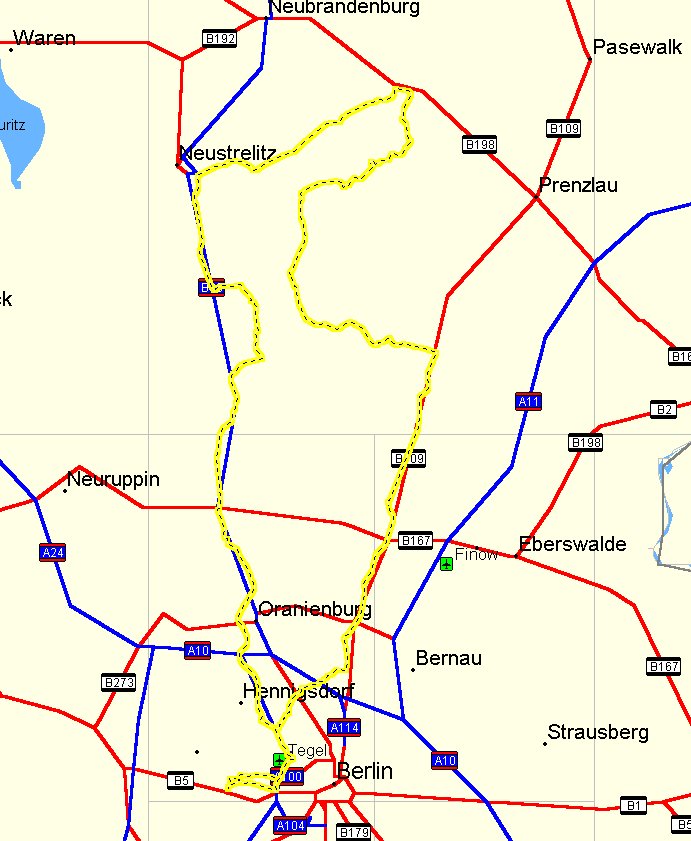 Treffpunkt "B5/B2" - Nonnendammallee - AS Jakob-Kaiser-Platz - AK Oranienburg - B96 - Gransee - Dannenwalde - Blumenow -Bredereiche - Himmelpfort - Fürstenberg/Havel - Neustrelitz - Zinow - Carpin - Möllenbeck - Stolpe - Bredenfelde - Rehberg - Hinrichshagen - Canzow - Woldegk - Göhren - Fürstenwerden - Wrechen - Tornowhof - Wittenhagen - Feldberg - Lüttenhagen - Grapkenteich - Triepkendorf - Beenz - Lychen - Densow - Alt Placht - Templin - Ahrensdorf - Milmersdorf - Ahlimbsmühle - Gollin - Groß Schönebeck (Schorfheide) - Zerpenschleuse - Klosterfelde - Wandlitz - Basdorf - Schönwalde - Mühlenbeck - Schönfließ - Glienicke/Nordbahn - B96 - AS Waidmannsluster Damm - AS Jakob-Kaiser-Platz - Nonnendammallee