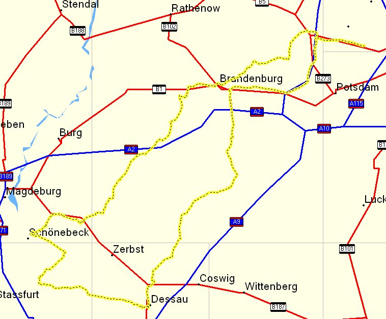 Treffpunkt "Start 2" - AS Berlin-Spandau - AS Groß Kreutz - Groß Kreutz - Jeserig - Neuschmerzke - Schmerzke - Rotscherlinde - Golzow - Ragösen - Dippmannsdorf - Lütte - Schwanebeck - Belzig - Klein Glien - Wiesenburg - Wiesenburg Bahnhof - Medewitzerhütten - Medewitz - Stackelitz - Jeber-Bergfrieden - Hundeluft - Thiessen - Mühlstedt - Meinsdorf - Roßlau - Dessau - Kleinkühnau - Aken/Elbe - Kühren - Lödderitz - Rajoch - Patzetz - Schwarz - Calbe/Saale - Barby/Elbe - Pömmelte - Schönebeck/Elbe - Grünewalde - Plötzky - Gommern - Dannigkow - Leitzkau - Göbel - Hobeck - Klepps - Loburg - Lübars - Drewitz - Magdeburgerforth - Schopsdorf - Ziesar - Bücknitz - Rogäsen - Wusterwitz - Siedlung Wusterwitz - Kirchmöser - Plaue - Brandenburg an der Havel - Klein Kreutz - Weseram - Roskow - Gutenpaaren - Zachow - Ketzin - Etzin - Wernitz - B5 - Treffpunkt "Start 2"