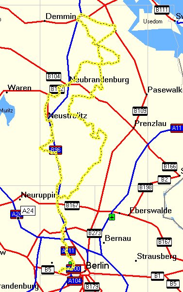 Treffpunkt "Start 3" - AS Siemensdamm - AK Oranienburg - Waldsiedlung - Nassenheide - Teschendorf - Löwenberg - Gransee - Altlüdersdorf - Dannenwalde - Gramzow - Fürstenberg/Havel - Steinförde - Großmenow - Strasen - Priepert - Bahnhof Düsterförde - B96 - Drewin - Neustrelitz - Brustorf - Peckatel - Penzlin - Löbkow - Alt Rehse - Neu Rähse - Wulkenzin - Neuendorf - Broda - Neubrandenburg - Ihlenfeld - Neverin - Rossow - Brunn - Dahlen - Salow - Friedland - Kavelpaß - Zinzow - Rubenow - Borntin - Schwerinshorst - Spantekow - Dennin - Wegezin - Albinshof - Krien - Steinmocker Vorwerk - Steinmocker - Neetzow - Groß Toitin - Jarmen - Breechen - Gützkow - Lüssow - Quilow - Groß Polzin - Menzlin - Jargelin - Ziethen - Anklam - Butzow - Blesewitz - Alt Sanitz - Neuenkirchen - Spantekow - Drewelow - Sarnow - Schweringsburg - Löwitz - Schwichtenberg - Sandhagen - Heinrichshöh - Friedland - Heinrichswalde - Neu Schönbeck - Schönbeck - Golm - Holzendorf - Ulrichshof - Kublank - Neetzka - Neu Käbelich - Alt Käbelich - Leppin - Dewitz - Burg Stargard - Godenswege - Blankensee - Watzkendorf - Möllenbeck - Feldberg - Wittenhagen - Conow - Funkenhagen - Thomsdorf - Rosenow - Hardenbeck - Mellenau - Buchenhain - Krewitz - Boitzenburg - Klaushagen - Jakobshagen - Klosterwalde - Am Fährkrug - Templin - Alsenhof - Hammelspring - Vogelsang - Zehdenick - Klein-Mutz - Bergsdorf - Häsen - Gutengermendorf - B96 - Löwenberg - Teschendorf - Nassenheide - Waldsiedlung - AK Oranienburg - AS Siemensdamm - Treffpunkt "Start 3"