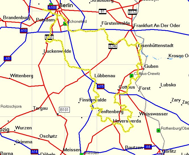 Berlin - Stadtautobahn A100 - AS Tempelhofer Damm - B96 - B101 - Berlin-Marienfelde - AK Ludwigsfelde-Ost - Thyrow - Trebbin - Christinendorf - Nunsdorf - Schünow - Siedlung Horstfelde - Nächst Neuendorf - Zossen - Waldstadt - Wünsdorf - Neuhof - Baruth - Golßen - Prierow - AS Freiwalde - Lübben/Spreewald - Ragow - Krimnitz - Lübbenau/Spreewald - Boblitz - AS Boblitz - Bischdorf - Mlode - Calau - Buchwäldchen - Luckaitz - Schöllnitz - Rettchendorf - Lug - Wormlage - Saalhausen - Freienhufen - Großräschen - Sedlitz - Senftenberg - Großkoschen - Lauta, Dorf - Lauta - Laubusch - Bergen - Hoyerswerda - Riegel - Lohsa - Sprey - Mulkwitz - Mühlrose - Schleife - Graustein - Spremberg - Groß Luja - Muckrow - Sellessen - Bühlow - Rehnsdorf - Auras - Schorbus - Klein Oßnig - Klein Gaglow - Großgaglow - Cottbus - Kiekebusch - Kahren - Heinersbrück - Grießen - Groß Gastrose - Atterwasch - Schenkendöbern - Grano - Lauschütz - Sembten - Groß Breesen - Bresinchen - Steinsdorf - Neuzelle - Eisenhüttenstadt/Winterhafen - Vogelsang - Ziltendorf - Pohlitz - Rießen - Schernsdorf - Müllrose - Ragow - Groß Rietz - Rietz-Neuendorf - Pfaffendorf - Alt Golm - AS Fürstenwalde Ost - AK Schönefeld - AD Neukölln - AD Funkturm - Heerstraße