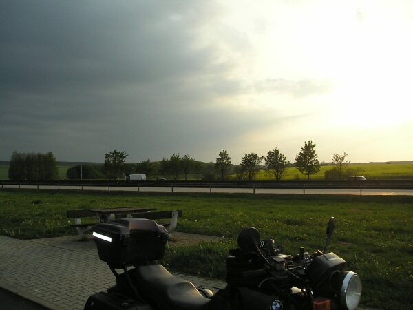 » Zwischen Nürnberg und Hermsdorfer Kreuz kam ich dann 2 mal in mittelprächtige Gewitterschauer und wurde "gut" naß, weil die Tourenhose leider auch schon nicht mehr das ist, was sie mal war ;)