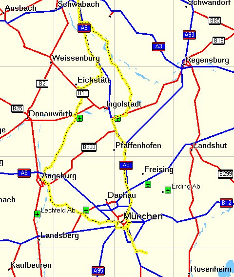 München - München Mittlerer Ring West - Germering - Puchheim - Hoflach - Fürstenfeldbruck - Mammendorf - Hattenhofen - Althegnenberg - Steinach Bei Mering - Merching - Mering - Sankt Afra - Neukissing - Augsburg - Mühlhausen - Bergen - Aulzhausen - Iglbach - Affing - Katzenthal - Weichenberg - Petersdorf - Gundelsdorf - Handzell - Pöttmes - Walda - Schönesberg - Ehekirchen - Isenhofen - Rohrenfels - Wagenhofen - Neuburg An Der Donau - Ried - Speckmühle - Nassenfels - Möckenlohe - Adelschlag - Eichstätt - Landershofen - Pfünz - Walting - Pfalzpaint - Gungolding - Arnsberg - Böhming - Kipferberg - Grösdorf - Kemathen - Kinding - AS Altmühltal - AD Potsdam - AD Werder - AK Berlin-Spandau - Berlin