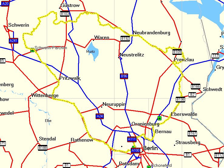 Treffpunkt "Start 3" - AS Siemensdamm - AS Hermsdorfer Damm - Glienicke/Nordbahn - Schönfließ - Mühlembeck - Schönwalde - Schönerlinde - Buch - Schwanebeck - Lindow - Bernau bei Berlin - Ladeburg - Lanke - Biesenthal - Melchow - Spechthausen - Eberswalde - Sandkrug - Amt Chorin - Serwest - Angermünde - Kerkow - Greiffenberg - Schmiedeberg - Polßen - Meichow - Gramzow - Bietikow - Prenzlau - Grünow bei Prenzlau - Grenz - Cremzow - Klockow - Schönfeld bei Pasewalk - Damerow - Nieden - Nechlin - Trebenow - Neumannshof - Lindhorst - Taschenberg - Kutzerow - Wolfshagen - Woldegk - Canzow - Alt Käbelich - Cölpin - Pragsdorf - Sponholz - Küssow - Neubrandenburg - Weitin - Chemnitz - Gädebehn - Rosenow - Briggow - Krummsee - Jürgenstorf - Rottmannshagen - Zettemin - Demzin - Malchin - Remplin - Neu Panstorf - Niendorf - Pampow - Teterow - Klein Köthel - Groß Wokern - Klaber - Rothspalk - Langenhagen - Kuchelmiß - Ahrenshagen - Groß Tessin - Reimershagen - Suckwitz - Lohmen - Zehna - Gutow - Bülow - Mühlengeez - Prüzen - Witzin - Pastin - Gägelow - Wamckow - Buerbeck - Prestin - Bülow - Badegow - Wessin - Crivitz - Klinken - Garwitz - Matzlow - Neu Matzlow - Damm - Parchim - Slate - Zachow - Tessenow - Marnitz - Suckow - Krumbeck - Putlitz - Triglitz - Steffenshagen - Pritzwalk - Eggersdorf - Mesendorf - Tüchen - Groß Welle - Neu Schrepkow - Kunow - Gumtow - Demerthin - Mechow - Kyritz - Bückwitz - Segeletz - Friesack - Pessin - Berge - AK Berlin-Spandau - Berlin