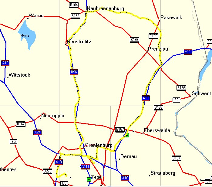 Schönfließ - Bergfelde - Birkenwerder - AS Birkenwerder - AK Oranienburg - B96 - Neubrandenburg - Küssow - Warlin - AS Neubrandenburg-Ost - A20 - AK Uckermark - A11 - AS Wandlitz - B273 - Wensickendorf - L21 - AS Mühlenbeck - A10 - AD Havelland - A10 - AS Brieselang - Brieselang - Falkensee